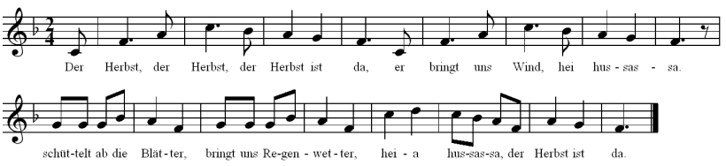 Der Herbst, der Herbst, der Herbst ist da, er bringt uns Wind, hei hussassa. schüttelt ab die Blätter, bringt uns Regenwetter, heia hussassa, der Herbst ist da. |
