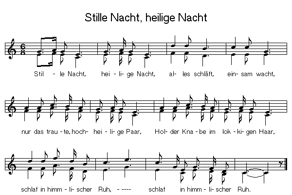Stille Nacht, heilige Nacht! Gottes Sohn, o wie lacht Lieb aus deinem göttlichen Mund, da uns schlägt die rettende Stund, Christ, in deiner Geburt, Christ, in deiner Geburt. |